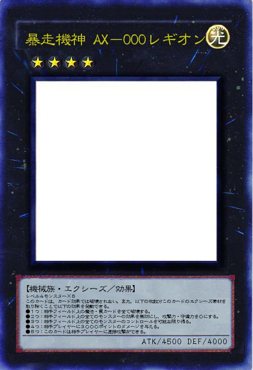 レベル4モンスター×5 このカードは、カード効果では破壊されない。また、以下の枚数分このカードのエクシーズ素材を取り除くことで以下の効果を発動できる。 ●1つ:相手フィールド上の魔法・罠カードを全て破壊する。 ●2つ:相手フィールド上の全てのモンスターの効果を無効にし、攻撃力・守備力を0にする。 ●3つ:相手フィールド上の全てのモンスターのコントロールを可能な限り得る。 ●4つ:相手プレイヤーに3000ポイントのダメージを与える。 ●5つ:このカードは相手プレイヤーに直接攻撃ができる。 |