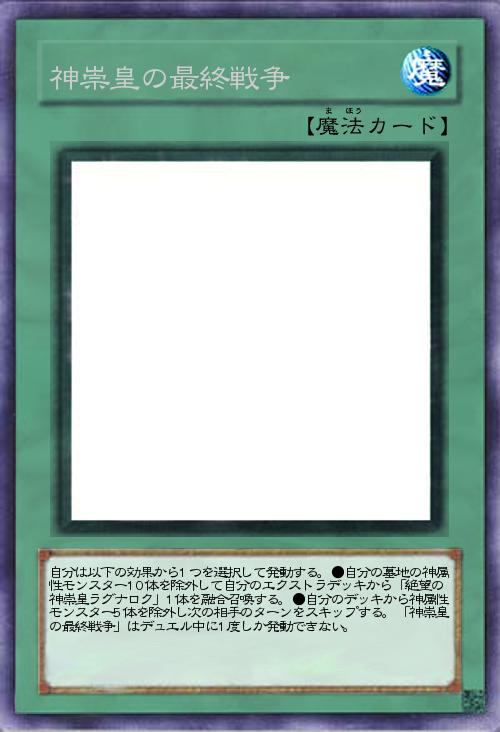| 自分は以下の効果から1つを選択して発動する。●自分の墓地の神属性モンスター10体を除外して自分のエクストラデッキから「絶望の神崇皇ラグナロク」1体を融合召喚する。●自分のデッキから神属性モンスター5体を除外し次の相手のターンをスキップする。「神崇皇の最終戦争」はデュエル中に1度しか発動できない。 | |||