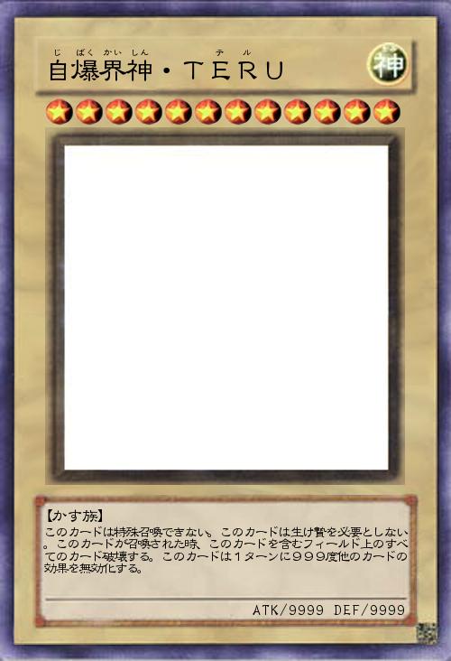 | このカードは特殊召喚できない。このカードは生け贄を必要としない。このカードが召喚された時、このカードを含むフィールド上のすべてのカード破壊する。このカードは1ターンに999度他のカードの効果を無効化する。 | |||