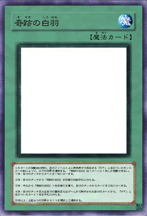 このカードの発動成功時の、自分フィールド上に表側表示で存在する「WF」と名のついたモンスターの数によって、以下の効果を適用する。「奇跡の白羽」は1ターンに1枚しか発動できない。 1体:自分のデッキからカードを1枚ドローする。 2体:自分のデッキから「奇跡の白羽」を任意の枚数手札に加える。 3体:手札から「奇跡の白羽」1枚を捨てる事で、自分のデッキからカードを2枚ドローする。 4体:自分のデッキまたは自分の墓地またはゲームから除外された自分のカードから、「WF」と名のついたカード1枚を手札に加える。 5体以上:上記4つの効果から1つを選択して適用する。 |