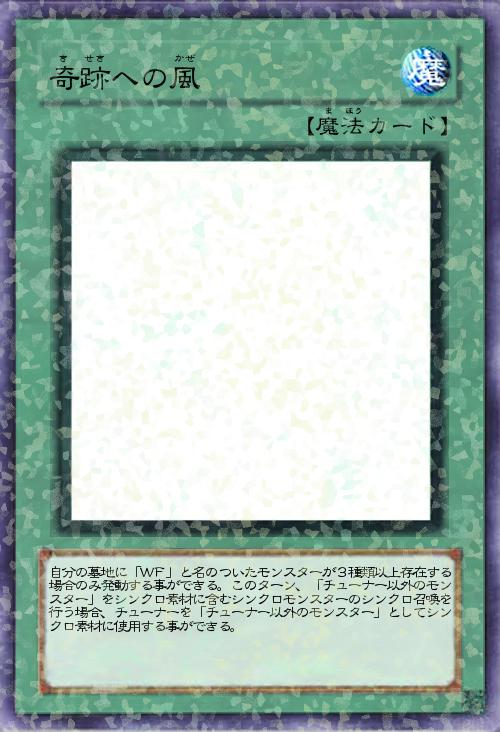 | 自分の墓地に「WF」と名のついたモンスターが3種類以上存在する場合のみ発動する事ができる。このターン、「チューナー以外のモンスター」をシンクロ素材に含むシンクロモンスターのシンクロ召喚を行う場合、チューナーを「チューナー以外のモンスター」としてシンクロ素材に使用する事ができる。 | |||