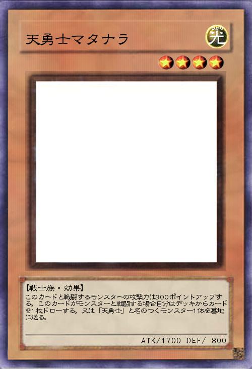 | このカードと戦闘するモンスターの攻撃力は300ポイントアップする。このカードがモンスターと戦闘する場合自分はデッキからカードを1枚ドローする。又は「天勇士」と名のつくモンスター1体を墓地に送る。 | |||
