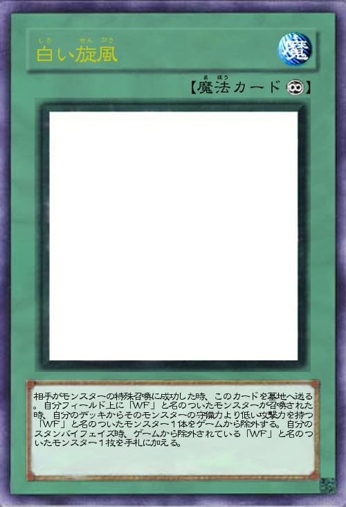 | 相手がモンスターの特殊召喚に成功した時、このカードを墓地へ送る。自分フィールド上に「WF」と名のついたモンスターが召喚された時、自分のデッキからそのモンスターの守備力より低い攻撃力を持つ「WF」と名のついたモンスター1体をゲームから除外する。自分のスタンバイフェイズ時、ゲームから除外されている「WF」と名のついたモンスター1枚を手札に加える。 | |||