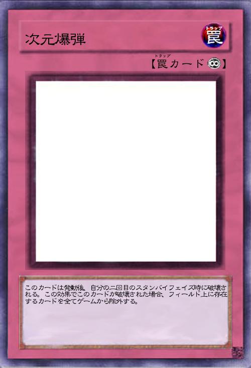 | このカードは発動後、自分の二回目のスタンバイフェイズ時に破壊される。この効果でこのカードが破壊された場合、フィールド上に存在するカードを全てゲームから除外する。 | |||