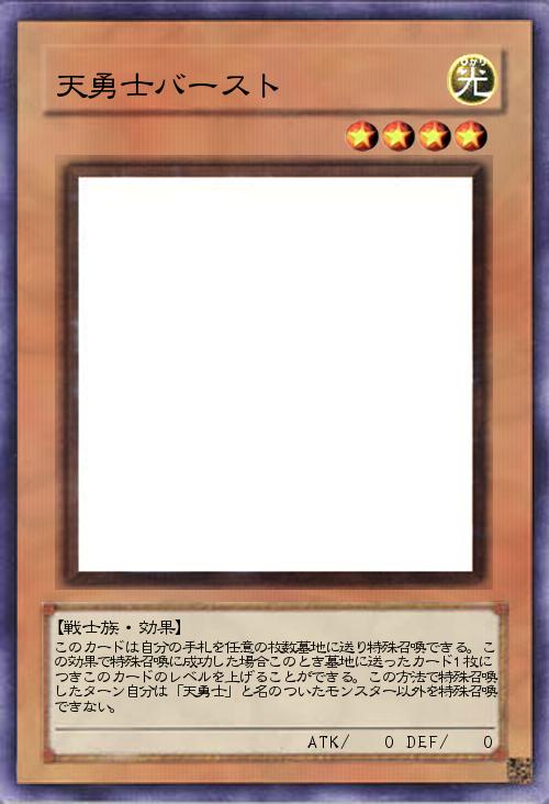 | このカードは自分の手札を任意の枚数墓地に送り特殊召喚できる。この効果で特殊召喚に成功した場合このとき墓地に送ったカード1枚につきこのカードのレベルを上げることができる。この方法で特殊召喚したターン自分は「天勇士」と名のついたモンスター以外を特殊召喚できない。 | |||