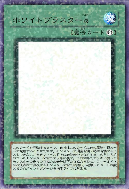 フィールド上の「WF」と名のついたモンスターを全てデッキに戻し、戻したモンスターの守備力の合計以下の守備力を持つモンスターを全て破壊する。破壊したモンスター1体に付き、相手に×500ポイントのダメージを与える。このカードを発動したターン、自分はこのカード以外の魔法・罠カードを発動することができず、通常召喚・特殊召喚することもできない。