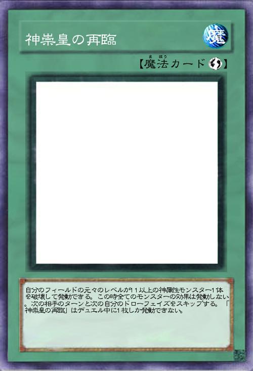 | 自分のフィールドの元々のレベルが11以上の神属性モンスター1体を破壊して発動できる。この時全てのモンスターの効果は発動しない。次の相手のターンと次の自分のドローフェイズをスキップする。「神崇皇の再臨」はデュエル中に1枚しか発動できない。 | |||