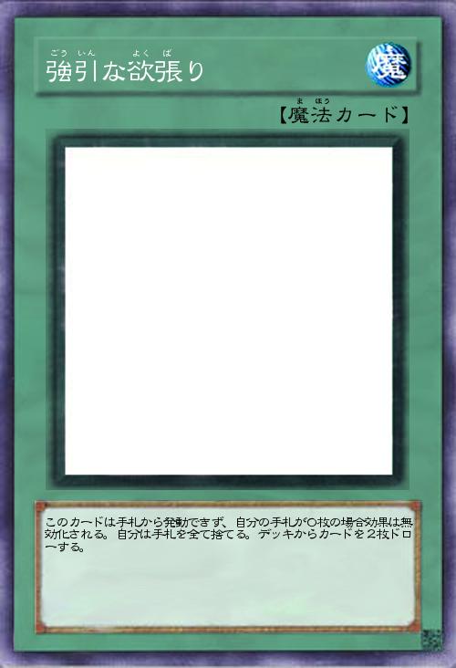 | このカードは手札から発動できず、自分の手札が0枚の場合効果は無効化される。自分は手札を全て捨てる。デッキからカードを2枚ドローする。 | |||