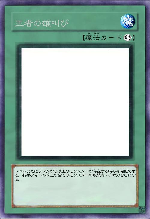 | レベルまたはランクが5以上のモンスターが存在する時のみ発動できる。相手フィールド上の全てのモンスターの攻撃力・守備力を0にする。 | |||