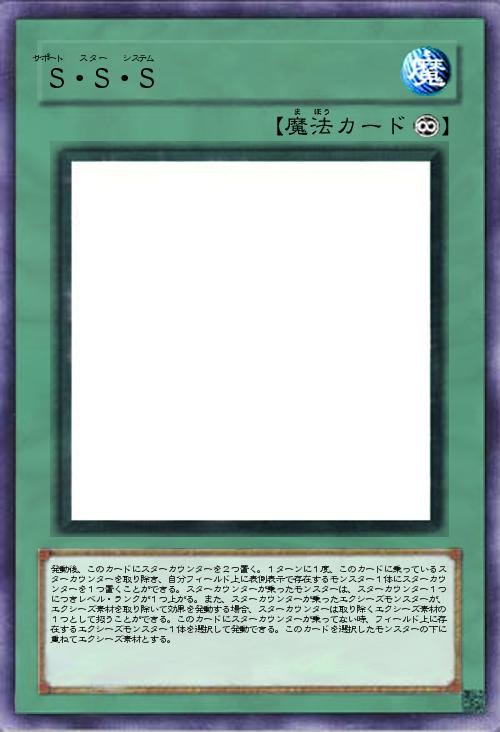 | 発動後、このカードにスターカウンターを2つ置く。1ターンに1度、このカードに乗っているスターカウンターを取り除き、自分フィールド上に表側表示で存在するモンスター1体にスターカウンターを1つ置くことができる。スターカウンターが乗ったモンスターは、スターカウンター1つにつきレベル・ランクが1つ上がる。また、スターカウンターが乗ったエクシーズモンスターが、エクシーズ素材を取り除いて効果を発動する場合、スターカウンターは取り除くエクシーズ素材の1つとして扱うことができる。このカードにスターカウンターが乗ってない時、フィールド上に存在するエクシーズモンスター1体を選択して発動できる。このカードを選択したモンスターの下に重ねてエクシーズ素材とする。 | |||