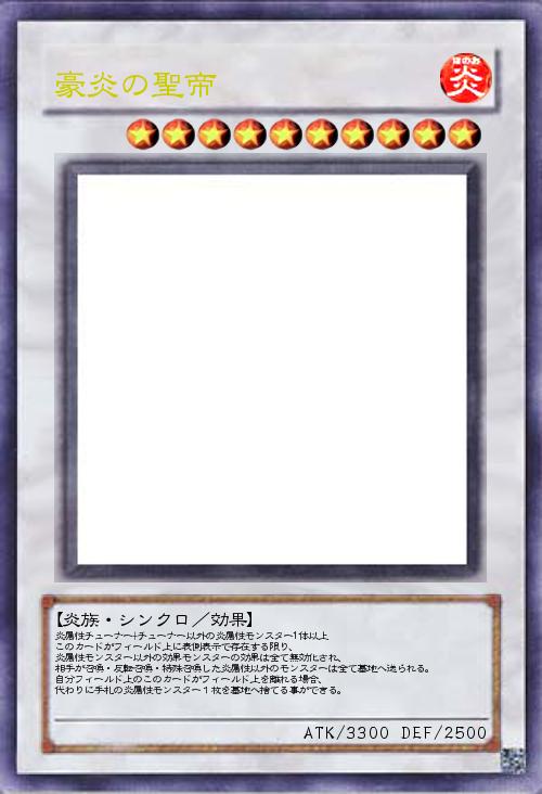 炎属性チューナー+チューナー以外の炎属性モンスター1体以上 このカードがフィールド上に表側表示で存在する限り、 炎属性モンスター以外の効果モンスターの効果は全て無効化され、 相手が召喚・反転召喚・特殊召喚した炎属性以外のモンスターは全て墓地へ送られる。 自分フィールド上のこのカードがフィールド上を離れる場合、 代わりに手札の炎属性モンスター1枚を墓地へ捨てる事ができる。 |