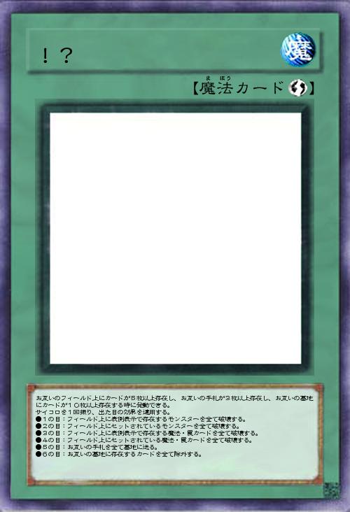 お互いのフィールド上にカードが5枚以上存在し、お互いの手札が3枚以上存在し、お互いの墓地にカードが10枚以上存在する時に発動できる。 サイコロを1回振り、出た目の効果を適用する。 ●1の目:フィールド上に表側表示で存在するモンスターを全て破壊する。 ●2の目:フィールド上にセットされているモンスターを全て破壊する。 ●3の目:フィールド上に表側表示で存在する魔法・罠カードを全て破壊する。 ●4の目:フィールド上にセットされている魔法・罠カードを全て破壊する。 ●5の目:お互いの手札を全て墓地に送る。 ●6の目:お互いの墓地に存在するカードを全て除外する。 |