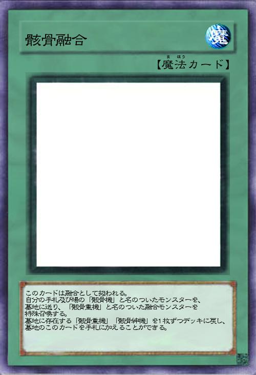 このカードは融合として扱われる。 自分の手札及び場の「骸骨機」と名のついたモンスターを、 墓地に送り、「骸骨重機」と名のついた融合モンスターを 特殊召喚する。 墓地に存在する「骸骨重機」「骸骨紳機」を1枚ずつデッキに戻し、 墓地のこのカードを手札に加えることができる。 |