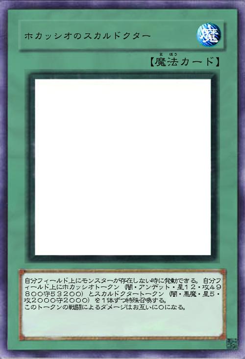 自分フィールド上にモンスターが存在しない時に発動できる。自分フィールド上にホカッシオトークン(闇・アンデット・星12・攻49800守53200)とスカルドクタートークン(闇・悪魔・星5・攻2000守2000)を1体ずつ特殊召喚する。 このトークンの戦闘によるダメージはお互いに0になる。 |