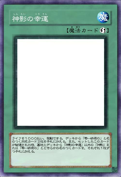 | ライフを1000払い、発動できる。デッキから「零―終焉の」と名のつく同名カード2枚を手札に加える。また、セットしたこのカードが破壊された時、墓地とデッキから「神影の幸運」以外の「神影」または「零―終焉の」とどちらかの名のつくカードを、それぞれ1枚ずつ手札に加える。 | |||