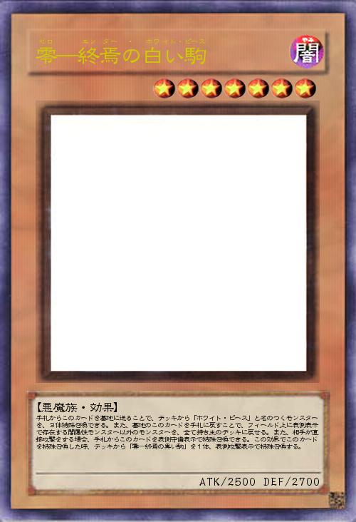 | 手札からこのカードを墓地に送ることで、デッキから「ホワイト・ピース」と名のつくモンスターを、3体特殊召喚できる。また、墓地のこのカードを手札に戻すことで、フィールド上に表側表示で存在する闇属性モンスター以外のモンスターを、全て持ち主のデッキに戻せる。また、相手が直接攻撃をする場合、手札からこのカードを表側守備表示で特殊召喚できる。この効果でこのカードを特殊召喚した時、デッキから「零―終焉の黒い駒」を1体、表側攻撃表示で特殊召喚する。 | |||