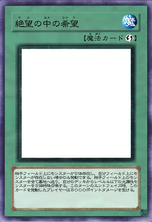 | 相手フィールド上にモンスターが5体存在し、自分フィールド上にモンスターが存在しない場合のみ発動できる。相手フィールド上のモンスターを全て墓地へ送り、自分のデッキからレベル4以下の光属性モンスターを5体特殊召喚する。このターンのエンドフェイズ時、このカードを発動したプレイヤーは8000ポイントダメージを受ける。 | |||