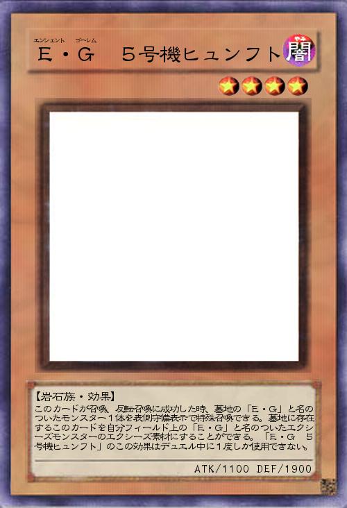 | このカードが召喚、反転召喚に成功した時、墓地の「E・G」と名のついたモンスター1体を表側守備表示で特殊召喚できる。墓地に存在するこのカードを自分フィールド上の「E・G」と名のついたエクシーズモンスターのエクシーズ素材にすることができる。「E・G 5号機ヒュンフト」のこの効果はデュエル中に1度しか使用できない。 | |||