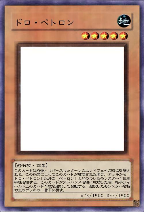 | このカードは召喚・リバースしたターンのエンドフェイズ時に破壊される。この効果によってこのカードが破壊された場合、デッキから「ドロ・ペトロン」以外の「ペトロン」と名のついたモンスター1体を特殊召喚する。このカードがアドバンス召喚に成功した時、相手フィールド上のカード1枚を選択して発動する。選択したモンスターを持ち主のデッキの一番下に戻す。 | |||