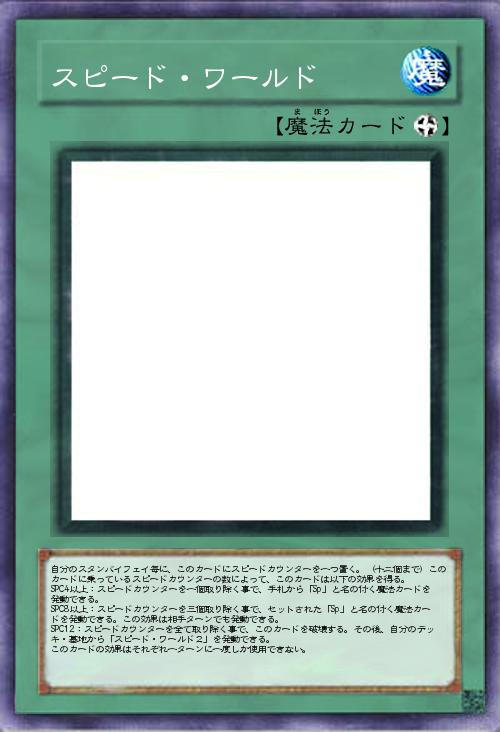 自分のスタンバイフェイ毎に、このカードにスピードカウンターを一つ置く。(十二個まで)このカードに乗っているスピードカウンターの数によって、このカードは以下の効果を得る。 SPC4以上:スピードカウンターを一個取り除く事で、手札から「Sp」と名の付く魔法カードを発動できる。 SPC8以上:スピードカウンターを三個取り除く事で、セットされた「Sp」と名の付く魔法カードを発動できる。この効果は相手ターンでも発動できる。 SPC12:スピードカウンターを全て取り除く事で、このカードを破壊する。その後、自分のデッキ・墓地から「スピード・ワールド2」を発動できる。 このカードの効果はそれぞれ一ターンに一度しか使用できない。 |
