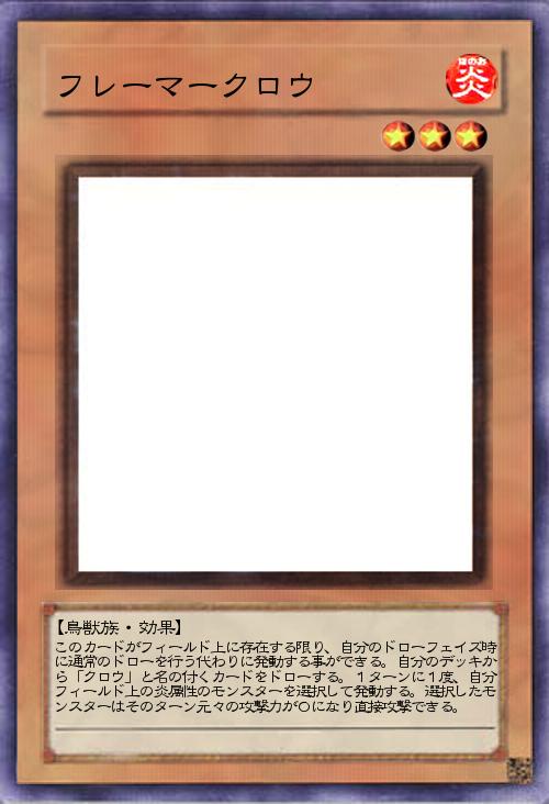| このカードがフィールド上に存在する限り、自分のドローフェイズ時に通常のドローを行う代わりに発動する事ができる。自分のデッキから「クロウ」と名の付くカードをドローする。1ターンに1度、自分フィールド上の炎属性のモンスターを選択して発動する。選択したモンスターはそのターン元々の攻撃力が0になり直接攻撃できる。 | |||