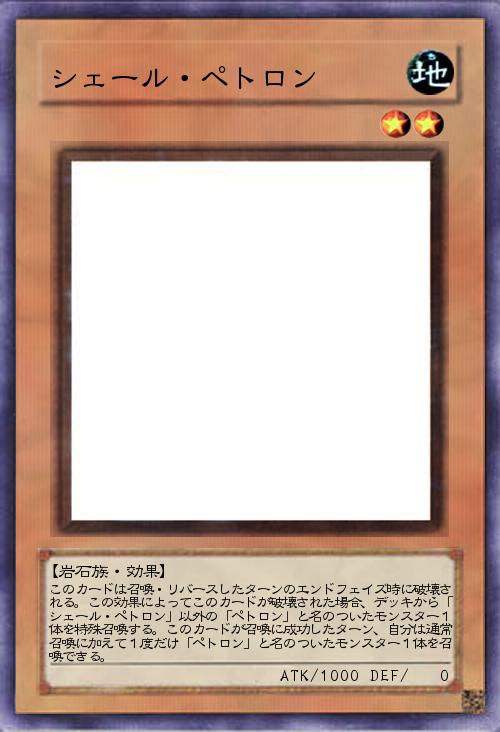 | このカードは召喚・リバースしたターンのエンドフェイズ時に破壊される。この効果によってこのカードが破壊された場合、デッキから「シェール・ペトロン」以外の「ペトロン」と名のついたモンスター1体を特殊召喚する。このカードが召喚に成功したターン、自分は通常召喚に加えて1度だけ「ペトロン」と名のついたモンスター1体を召喚できる。 | |||