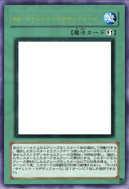 | 自分フィールド上のエクシーズモンスター1体を選択して発動できる。選択したモンスターよりランクが1つ高いエクシーズモンスター1体をエクストラデッキからエクシーズ召喚扱いで特殊召喚し、選択したモンスターとこのカードをエクシーズ素材にする。このカードをエクシーズ素材にしたエクシーズモンスターは以下の効果を得る。・1ターンに1度、このカードは戦闘及び効果で破壊されない。「RUM-サイレント・ロデオンフォース」は1ターンに1枚しか使用できない。 | |||