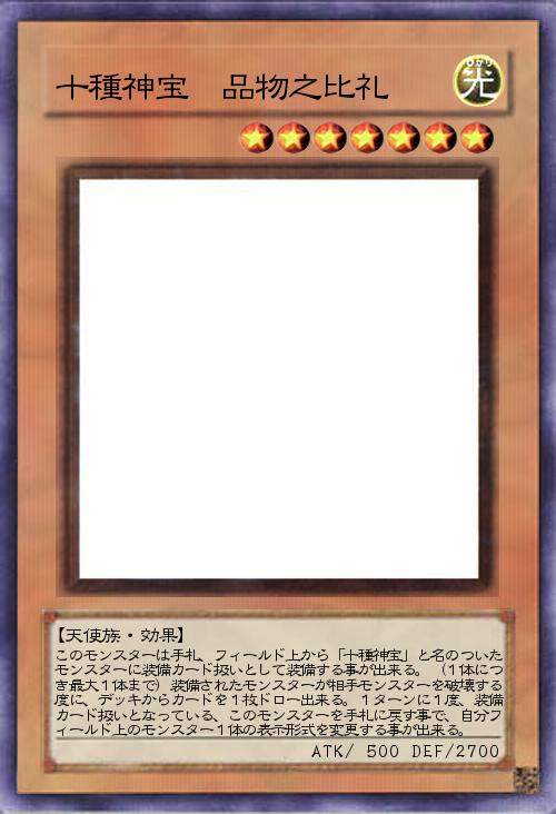 | このモンスターは手札、フィールド上から「十種神宝」と名のついたモンスターに装備カード扱いとして装備する事が出来る。(1体につき最大1体まで)装備されたモンスターが相手モンスターを破壊する度に、デッキからカードを1枚ドロー出来る。1ターンに1度、装備カード扱いとなっている、このモンスターを手札に戻す事で、自分フィールド上のモンスター1体の表示形式を変更する事が出来る。 | |||