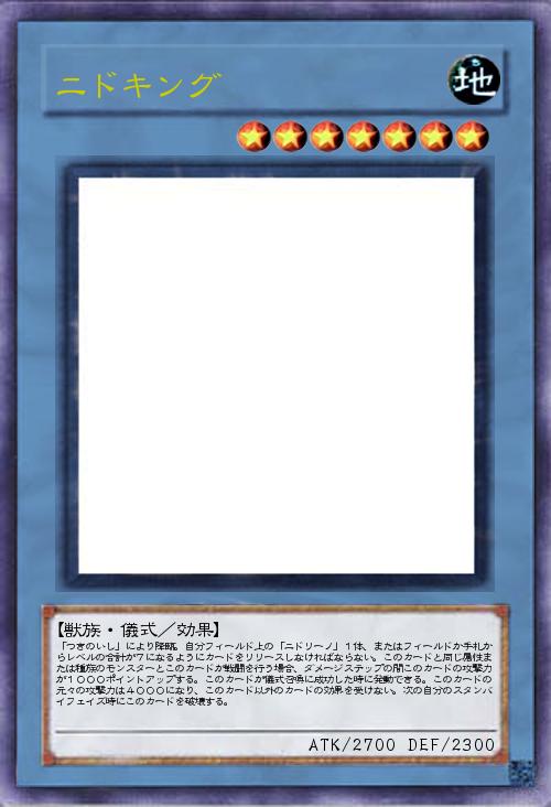 | 「つきのいし」により降臨。自分フィールド上の「ニドリーノ」1体、またはフィールドか手札からレベルの合計が7になるようにカードをリリースしなければならない。このカードと同じ属性または種族のモンスターとこのカードが戦闘を行う場合、ダメージステップの間このカードの攻撃力が1000ポイントアップする。このカードが儀式召喚に成功した時に発動できる。このカードの元々の攻撃力は4000になり、このカード以外のカードの効果を受けない。次の自分のスタンバイフェイズ時にこのカードを破壊する。 | |||