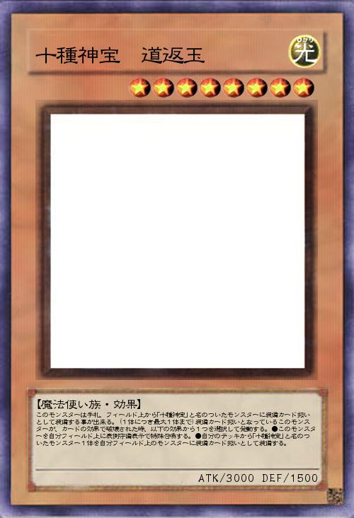 | このモンスターは手札、フィールド上から「十種神宝」と名のついたモンスターに装備カード扱いとして装備する事が出来る。(1体につき最大1体まで)装備カード扱いとなっているこのモンスターが、カードの効果で破壊された時、以下の効果から1つを選択して発動する。●このモンスターを自分フィールド上に表側守備表示で特殊召喚する。●自分のデッキから「十種神宝」と名のついたモンスター1体を自分フィールド上のモンスターに装備カード扱いとして装備する。 | |||