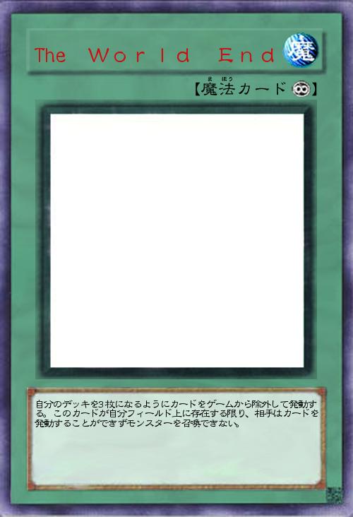 | 自分のデッキを3枚になるようにカードをゲームから除外して発動する。このカードが自分フィールド上に存在する限り、相手はカードを発動することができずモンスターを召喚できない。 | |||