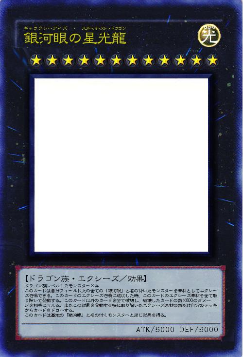 ドラゴン族レベル12モンスター×4 このカードは自分フィールド上の全ての「銀河眼」と名の付いたモンスターを素材としてエクシーズ召喚できる。このカードのエクシーズ召喚に成功した時、このカードのエクシーズ素材を全て取り除いて発動する。このカード以外のカードを全て破壊し、破壊したカードの数×800のダメージを相手に与える。またこの効果を発動する時に取り除いたエクシーズ素材の数だけ自分のデッキからカードをドローする。 このカードは墓地の「銀河眼」と名の付くモンスターと同じ効果を得る。 |