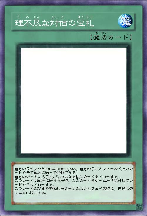 自分のライフを50になるまで払い、自分の手札とフィールド上のカードを全て墓地に送って発動できる。 自分のデッキから手札が7枚になる様にカードをドローする。 このカードが墓地に送られた時、このカードをゲームから除外してカードを3枚ドローする。 このカードの効果を発動したターンのエンドフェイズ時に、自分はデュエルに敗北する。 |