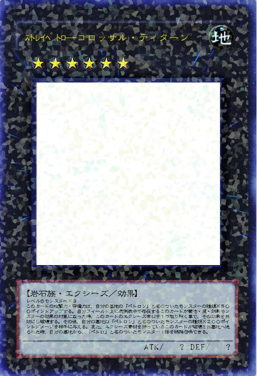 レベル6モンスター×3 このカードの攻撃力・守備力は、自分の墓地の「ペトロン」と名のついたモンスターの種類×500ポイントアップする。自分フィールド上に表側表示で存在するこのカードが魔法・罠・効果モンスターの効果の対象になった時、このカードのエクシーズ素材を1つ取り除く事で、その効果を無効にし破壊する。その後、自分の墓地の「ペトロン」と名のついたモンスターの種類×200ポイントダメージを相手に与える。また、エクシーズ素材を持っているこのカードが破壊され墓地へ送られた時、自分の墓地から、「ペトロ」と名のついたモンスター1体を特殊召喚できる。 |