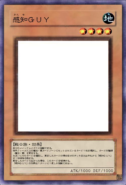 自分のメインフェイズ1に発動できる。 相手フィールド上の魔法・罠カードゾーンにセットされているカード1枚を選択し、カードの種類(魔法・罠)を宣言する。 お互いにそのカードを確認し、宣言したカードの場合自分のデッキまたは手札から「感知GUY」を1体特殊召喚する。 宣言したカードでなかった場合、このカードを破壊する。 「感知GUY」の効果は1ターンに1度しか発動できない。 |