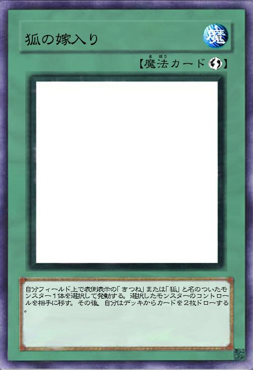 | 自分フィールド上で表側表示の「きつね」または「狐」と名のついたモンスター1体を選択して発動する。選択したモンスターのコントロールを相手に移す。その後、自分はデッキからカードを2枚ドローする。 | |||