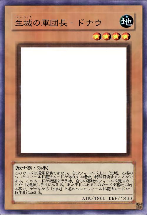 | このカードは通常召喚できない。自分フィールド上に「生城」と名のついたフィールド魔法カードが存在する場合、特殊召喚することができる。このカードが戦闘を行う時、自分の墓地のフィールド魔法カードを1枚選択し手札に加える。また手札にあるこのカードを墓地に送る事で、デッキから「生城」と名のついたフィールド魔法カードを1枚手札に加える。 | |||