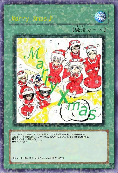このカードは、本日の日付が12月24日、及び12月25日の場合のみ発動できる。 このカードを発動したプレイヤーの恋人の有無によって、以下の効果を適用する。 ●恋人がいる:爆発する。 ●恋人がいない:(´;ω ;`) 「メリークリスマス♪ あなたはいかがお過ごしで?」 |