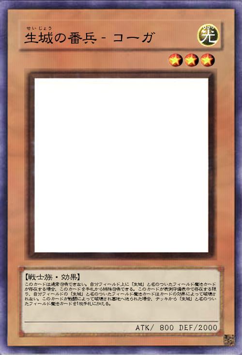 「生城シリーズ第5段は番兵が登場です。生城のモンスター共通の効果である、生城がないと俺達は行き場がないんだ効果。前回の軍団長が手札から切ってデッキからサーチだったので、今回は戦闘破壊がトリガーの墓地からサーチで作ってみました。番兵なので守る効果も付けてみました。もちろん罪深き生城との相互作用もバッチリ!」(2013-12-25 11:56)