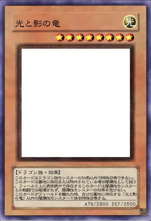 このカードはドラゴン族モンスターの効果以外で特殊召喚できない。このカードは墓地に存在または除外されている場合闇属性として扱う。フィールド上に表側表示で存在するこのカードは闇属性モンスターとの戦闘では破壊されず、闇属性モンスターの効果を受けない。 このカードがフィールドを離れた時、自分の墓地に存在する「光と影の竜」以外の闇属性モンスター1体を特殊召喚する。 |