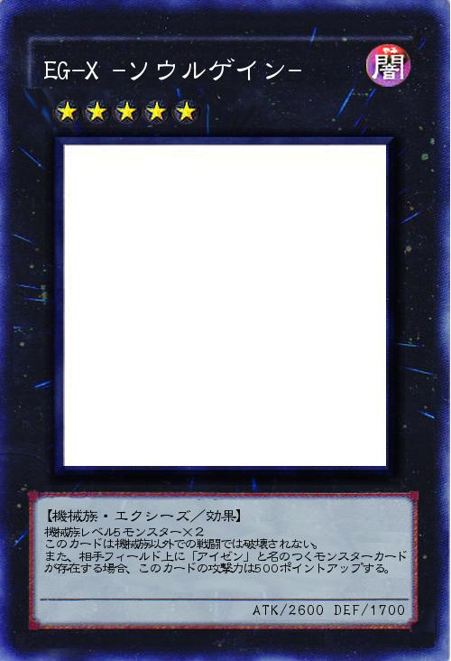 機械族レベル5モンスター×2 このカードは機械族以外での戦闘では破壊されない。 また、相手フィールド上に「アイゼン」と名のつくモンスターカードが存在する場合、このカードの攻撃力は500ポイントアップする。 |