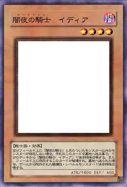 | 自分フィールド上に「闇夜の騎士」と名のついたモンスター以外のモンスターが存在しない場合、手札のこのカードを墓地へ送る事で、で分のデッキから「闇夜の騎士 イディア」1体を特殊召喚する。また、フィールド上に存在するこのカードが破壊され、墓地へ送られた場合、ゲームから除外された闇属性・レベル4モンスター1体を特殊召喚する。 | |||
