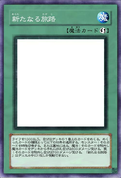 | ライフを1000払う。自分はデッキの1番上のカードをめくる。めくったカードの種類よって以下の効果を適用する。モンスター:そのカードを特殊召喚する。または墓地に送る。魔法:そのカードを除外し魔法カードをデッキから手札に加え自分は600ダメージ受ける。罠:そのカードを除外し自分は700ダメージ受ける。「新たなる旅路」はデュエル中に1枚しか発動できない。 | |||