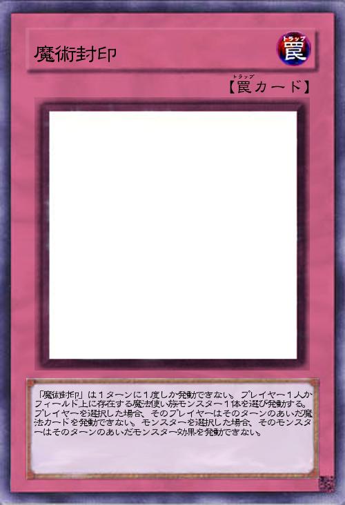 | 「魔術封印」は1ターンに1度しか発動できない。プレイヤー1人かフィールド上に存在する魔法使い族モンスター1体を選び発動する。プレイヤーを選択した場合、そのプレイヤーはそのターンのあいだ魔法カードを発動できない。モンスターを選択した場合、そのモンスターはそのターンのあいだモンスター効果を発動できない。 | |||