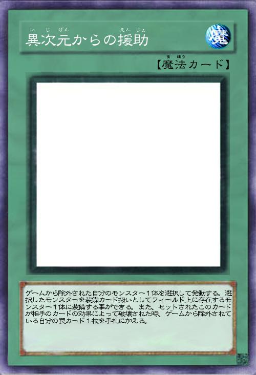 | ゲームから除外された自分のモンスター1体を選択して発動する。選択したモンスターを装備カード扱いとしてフィールド上に存在するモンスター1体に装備する事ができる。また、セットされたこのカードが相手のカードの効果によって破壊された時、ゲームから除外されている自分の罠カード1枚を手札に加える。 | |||