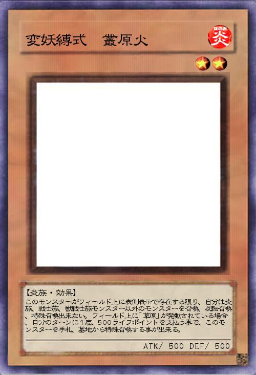 | このモンスターがフィールド上に表側表示で存在する限り、自分は炎族、戦士族、獣戦士族モンスター以外のモンスターを召喚、反転召喚、特殊召喚出来ない。フィールド上に「草原」が発動されている場合、自分のターンに1度、500ライフポイントを支払う事で、このモンスターを手札、墓地から特殊召喚する事が出来る。 | |||