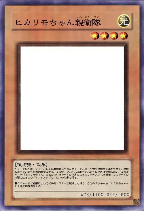 1ターンに1度、フィールド上に裏側表示で存在するモンスター1体を選択する事ができる。選択したモンスターを表側表示にする。この時、リバース効果モンスターの効果は発動しない。このカードが「ヒカリモちゃん」と名のついたカードの効果によってリバースされた場合、このカードの攻撃力は800ポイントアップし、以下の効果も得る。 ●このカードが戦闘によって相手モンスターを破壊した場合、自分のデッキから「ヒカリモちゃん」1体を特殊召喚する。 |