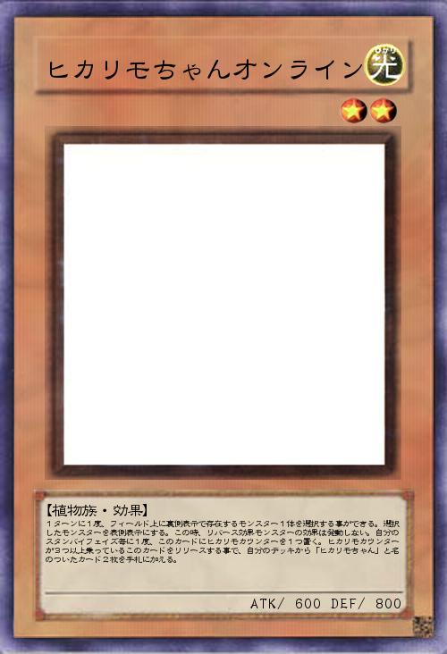 | 1ターンに1度、フィールド上に裏側表示で存在するモンスター1体を選択する事ができる。選択したモンスターを表側表示にする。この時、リバース効果モンスターの効果は発動しない。自分のスタンバイフェイズ毎に1度、このカードにヒカリモカウンターを1つ置く。ヒカリモカウンターが3つ以上乗っているこのカードをリリースする事で、自分のデッキから「ヒカリモちゃん」と名のついたカード2枚を手札に加える。 | |||