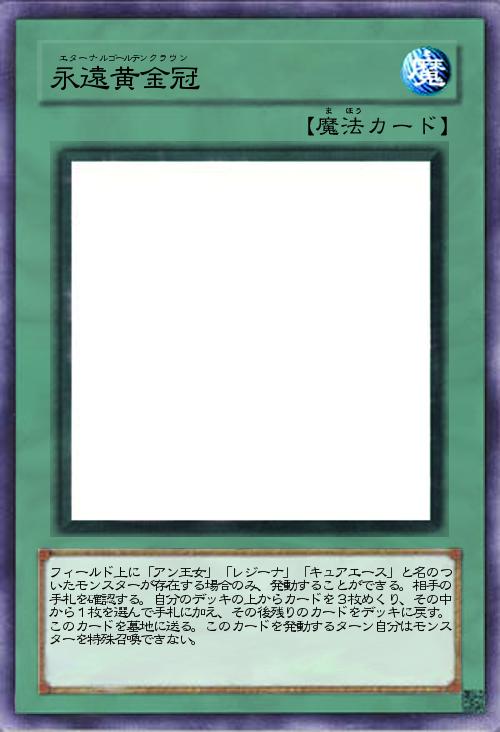 | フィールド上に「アン王女」「レジーナ」「キュアエース」と名のついたモンスターが存在する場合のみ、発動することができる。相手の手札を確認する。自分のデッキの上からカードを3枚めくり、その中から1枚を選んで手札に加え、その後残りのカードをデッキに戻す。このカードを墓地に送る。このカードを発動するターン自分はモンスターを特殊召喚できない。 | |||