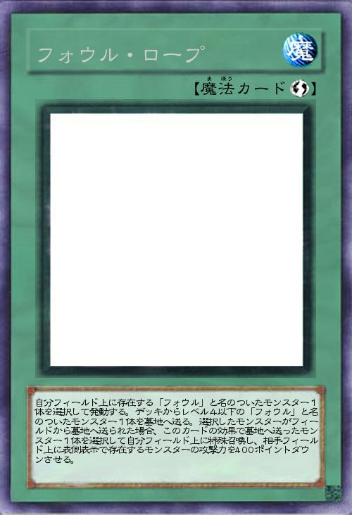 | 自分フィールド上に存在する「フォウル」と名のついたモンスター1体を選択して発動する。デッキからレベル4以下の「フォウル」と名のついたモンスター1体を墓地へ送る。選択したモンスターがフィールドから墓地へ送られた場合、このカードの効果で墓地へ送ったモンスター1体を選択して自分フィールド上に特殊召喚し、相手フィールド上に表側表示で存在するモンスターの攻撃力を400ポイントダウンさせる。 | |||